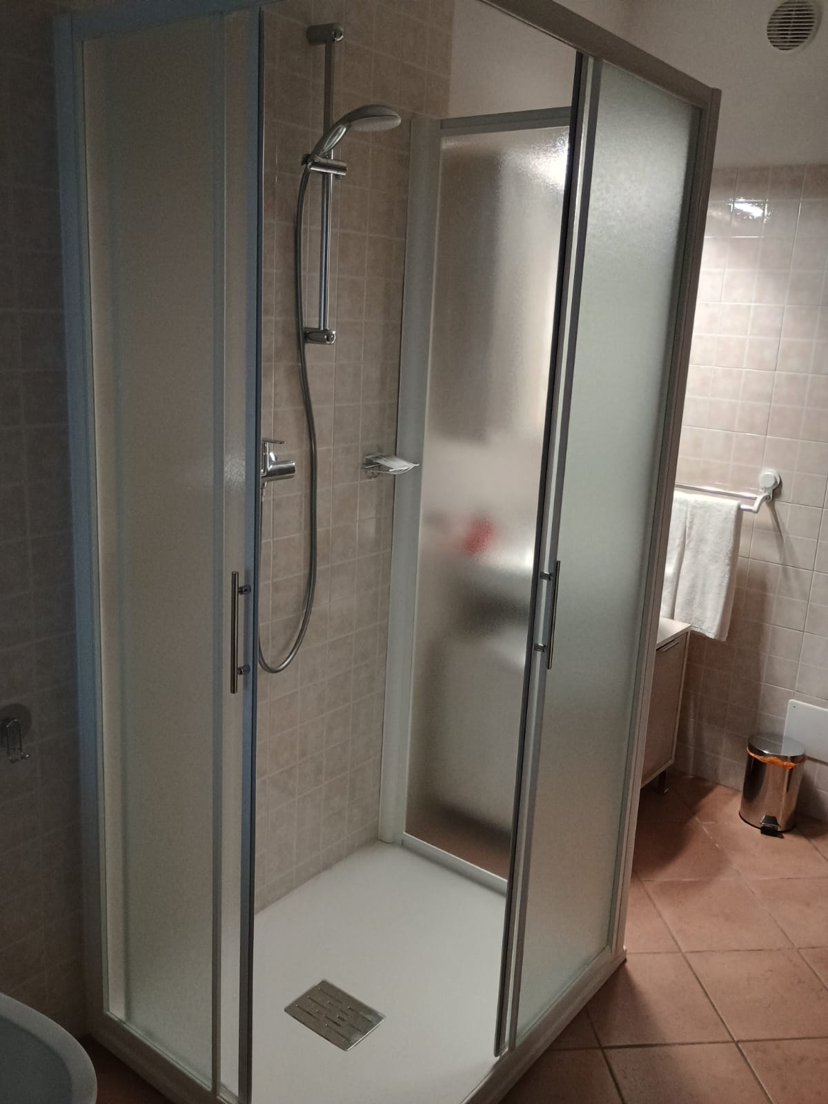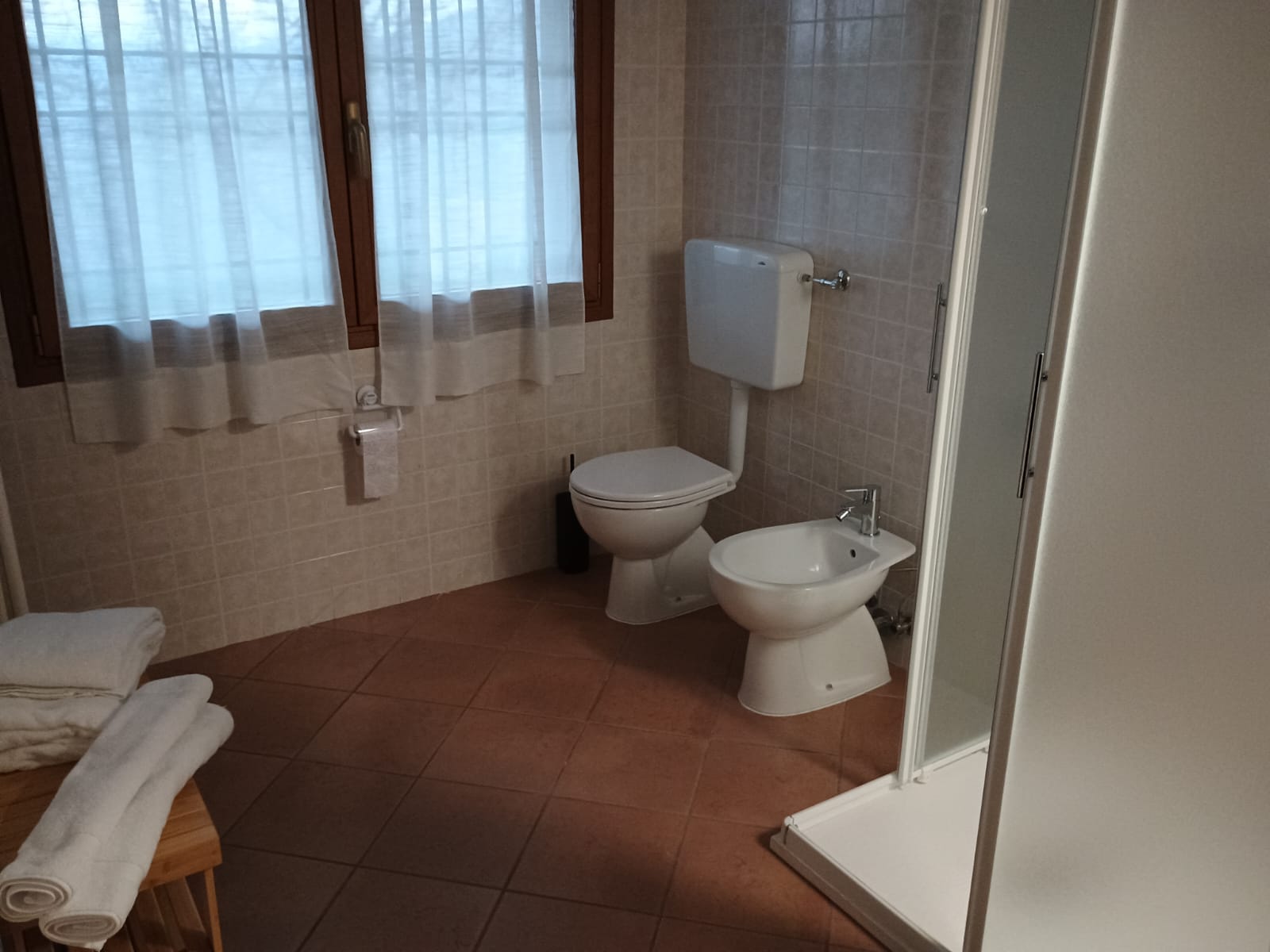 Il bagno privato, moderno e funzionale, è completo di una spaziosa doccia, bidet, asciugacapelli e un set di prodotti da bagno in omaggio, oltre a morbidi asciugamani e tutta la carta igienica necessaria.